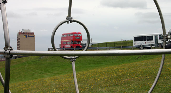 The Roaming Eyeball is a large steel sphere with a digital video camera mounted internally. The Eyeball is rolled around the streets while the video camera documents its path. As it rolls, the camera records a sequence of asphalt, streetscape and sky, and in this cycle of imagery a pattern of the panoramic emerges.